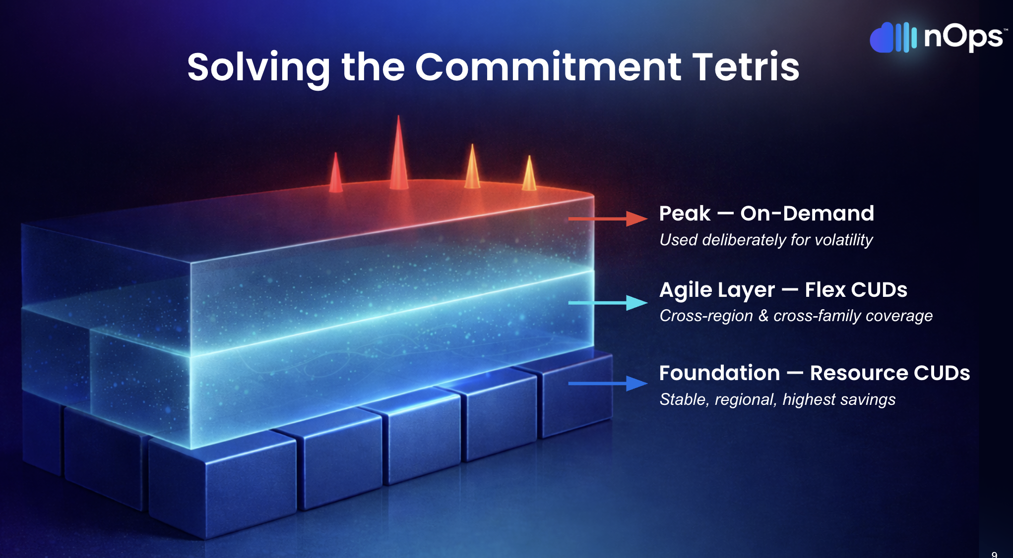 Layer 2 — Agile (flex CUDs). Cross-region traffic, shifting machine families, containerized workloads that auto-scale and move across services. Flex CUDs follow the spend, so when engineering changes the underlying infrastructure, coverage doesn’t break.