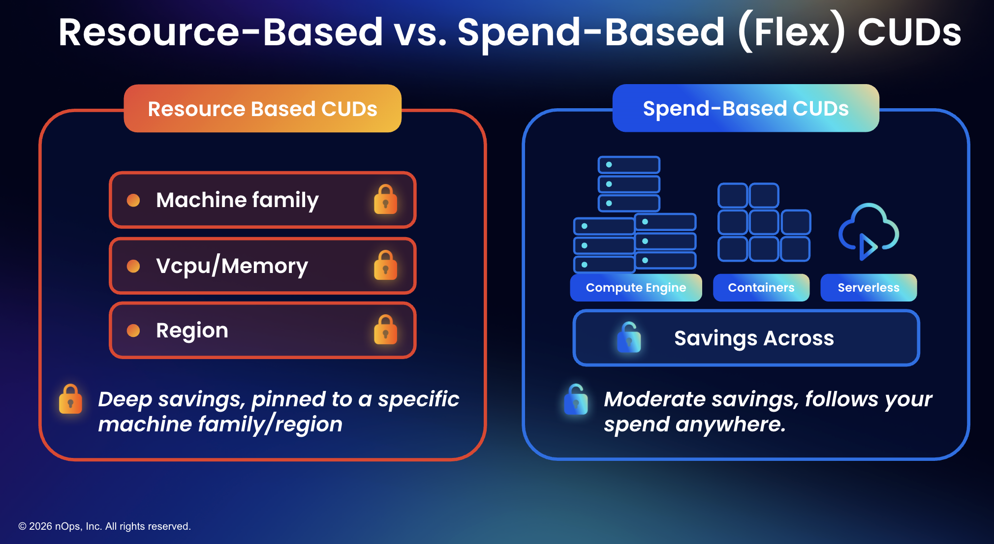 There’s a common assumption — especially from finance teams — that flex CUDs (spend-based committed use discounts) are always the better choice because of their flexibility. Buy a flex CUD, it follows your spend across eligible services like Compute Engine, GKE, and Cloud Run, and you don’t have to worry about which machine family or region your workloads land on.