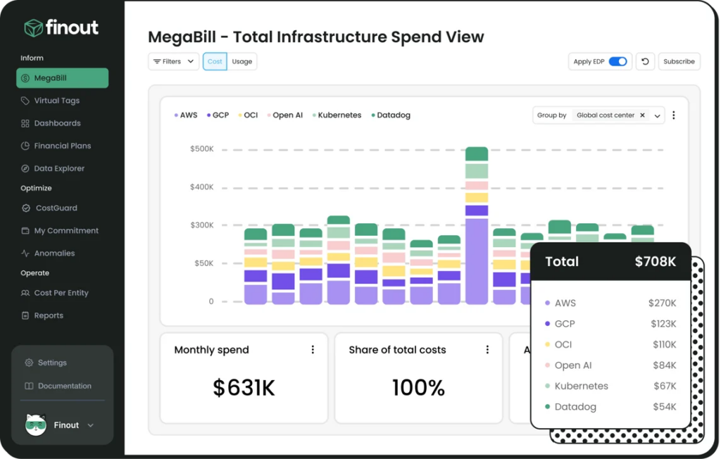 Finout is a third-party FinOps cost management/visibility platform built to unify and allocate spend across cloud providers and Azure services into a single “MegaBill,” with a focus on granular cost allocation and visibility for engineering and finance.