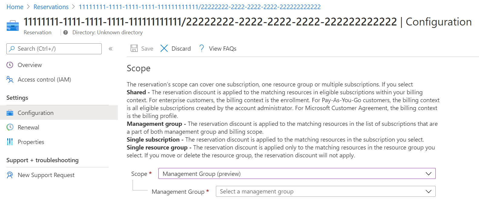 Azure Reservations: are purchased with a scope as well (resource group, subscription, or shared). If you choose shared scope, the reservation discount can apply to matching resources across eligible subscriptions within your billing context, and you can change the scope after purchase (and even split reservations to assign different portions to different scopes).