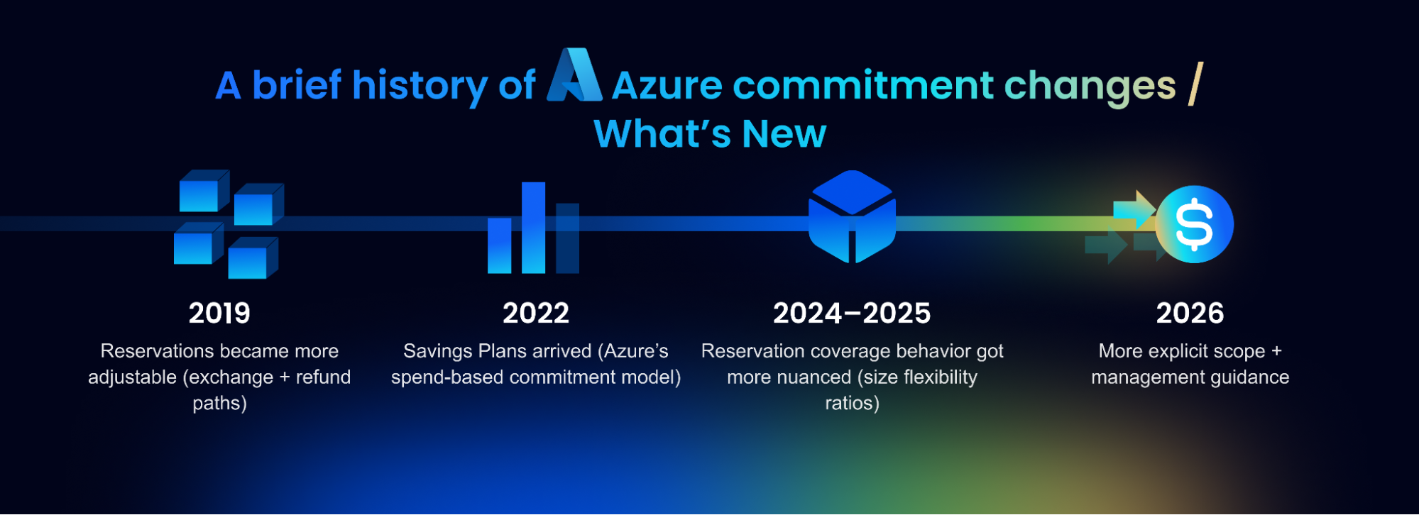 Microsoft hasn’t changed the core idea (commit for a discount), but Azure’s commitment programs have evolved in what they cover, how flexible they are to manage, and what can impact utilization over the last few years.