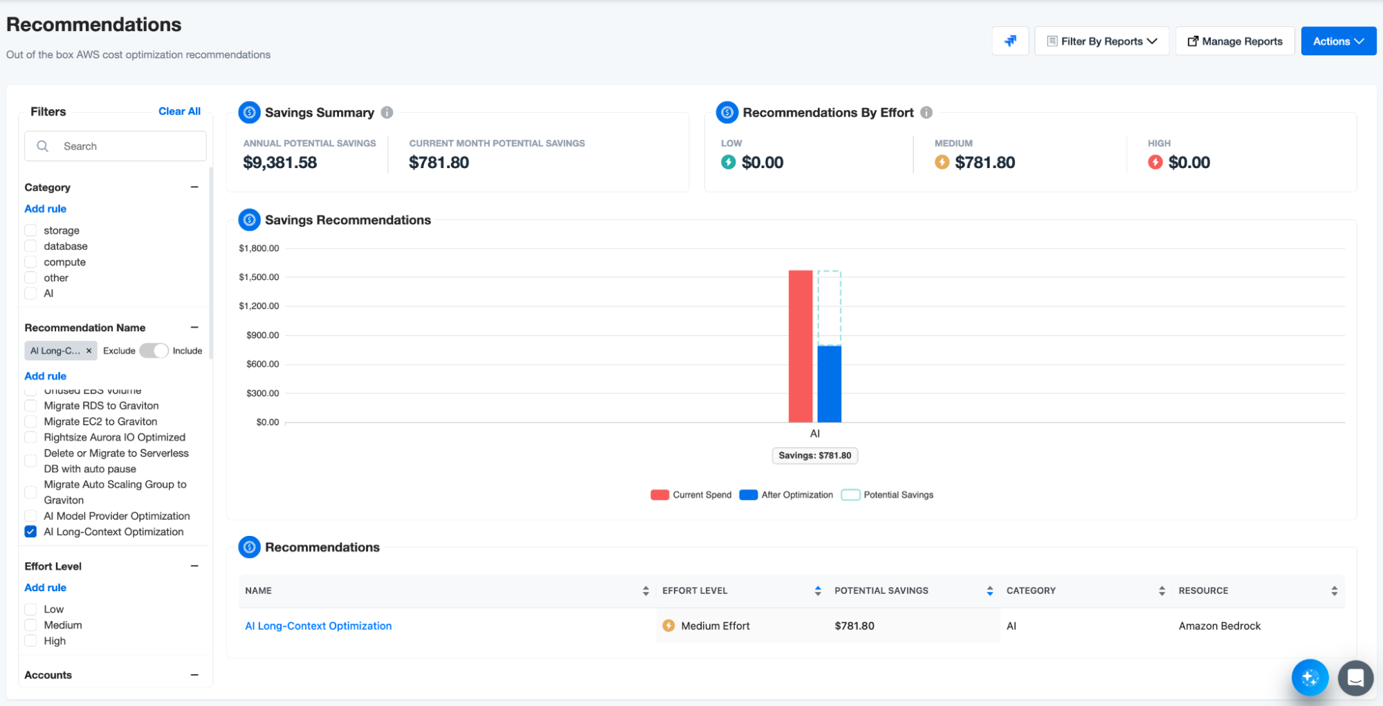 To start using Amazon Bedrock Long Context Usage Detection, navigate to Inform → Cost Saving Recommendations → AI Category.