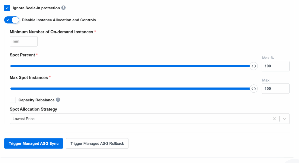Get fine-grained control over how Spot is used within your ASGs. You can easily define the percentage or number of Spot instances you want to run, or even set a base capacity of On-Demand instances and allow Spot to scale on top. With “minimum number of On-Demand instances” safeguards, you maintain guaranteed baseline capacity and stability — while still capturing the cost benefits of Spot for all incremental scaling.
