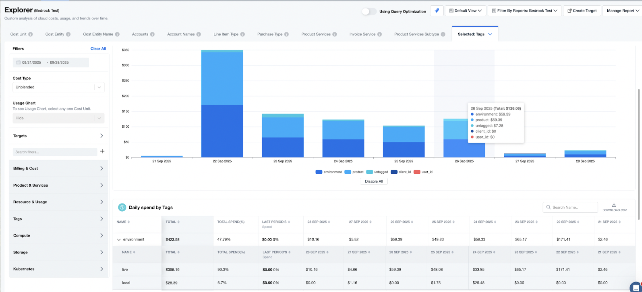 Request Metadata becomes tags in nOps, letting you attribute every dollar spent to specific teams, projects, customers, or business units. Now you can allocate AI costs on Bedrock accurately: slice and dice your Bedrock spending by any custom tag you define in your API calls, from team names to customer IDs to application versions.