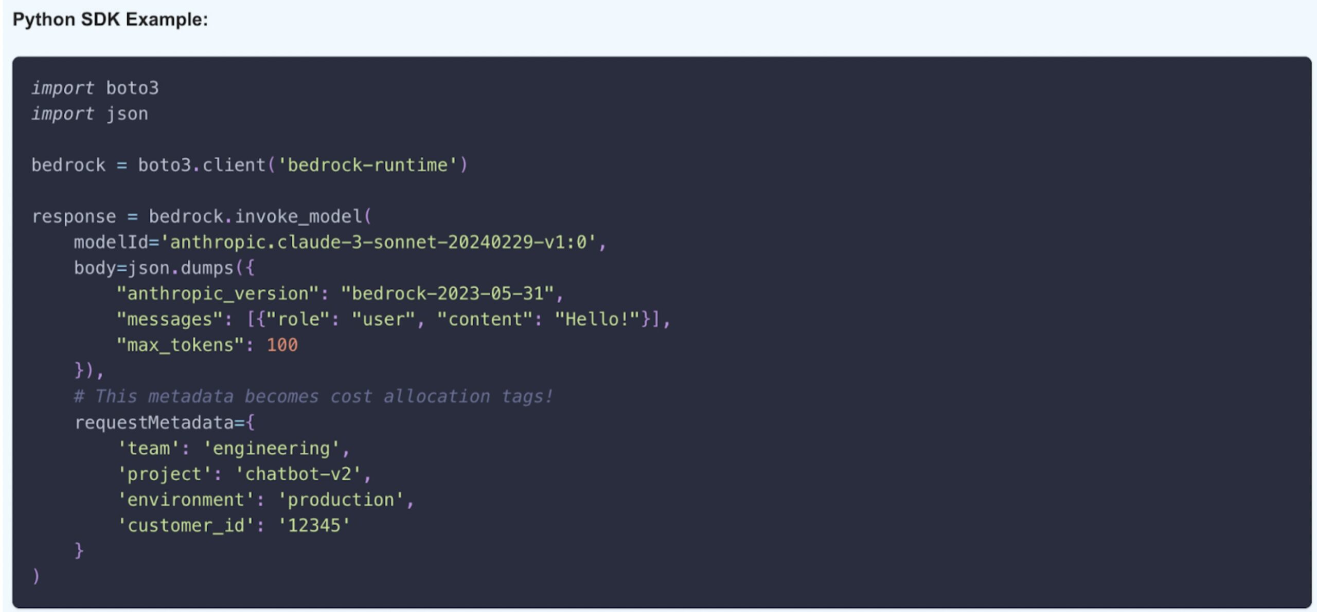 Include metadata in your Bedrock API calls like `team: ‘engineering’`, `project: ‘chatbot-v2’`, or `customer_id: ‘12345’`, and every key-value pair automatically becomes a cost allocation dimension in nOps. Finally, you can answer questions like “How much does our AI chatbot cost per customer?” or “Which engineering team needs to optimize their AI usage?” without manual tracking or guesswork.