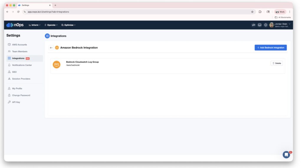 We’re excited to unveil our new Amazon Bedrock Integration, the latest addition to nOps Inform, designed specifically to help your business gain unprecedented visibility into AI spending with second-by-second granularity for every model invocation. Starting today, you can access this new integration directly from your Organization Settings under Integrations.