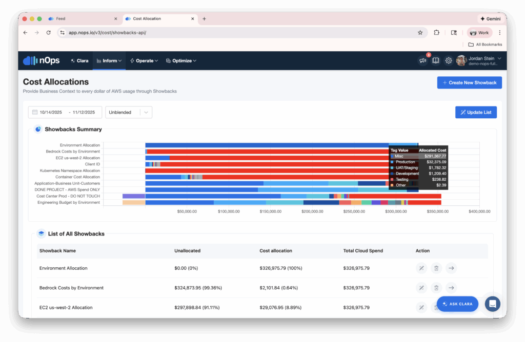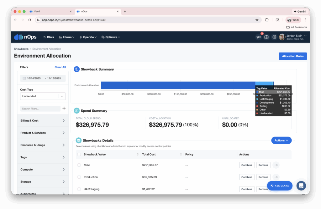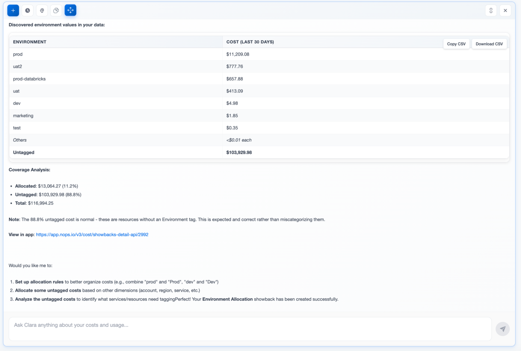 The entire process happens conversationally. You don’t need to understand the technical details of showback configuration, allocation rule types, or tag key selection — Clara handles that complexity while keeping you in control.