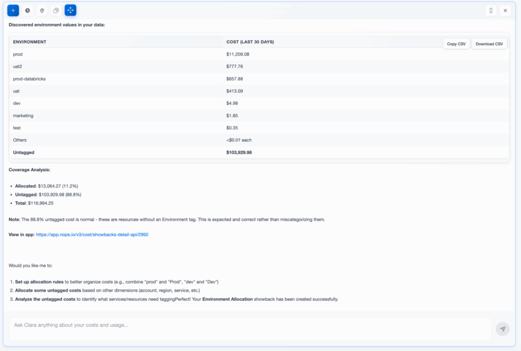 Clara’s ability to help define these rules, with insights into your real data, make distributing unallocated costs across teams, projects, or cost centers effortless. Clara can automatically create allocation rules based on your spending patterns, distribute costs by percentage of spend, assign costs directly to specific showback values, or split costs evenly — all through conversation.