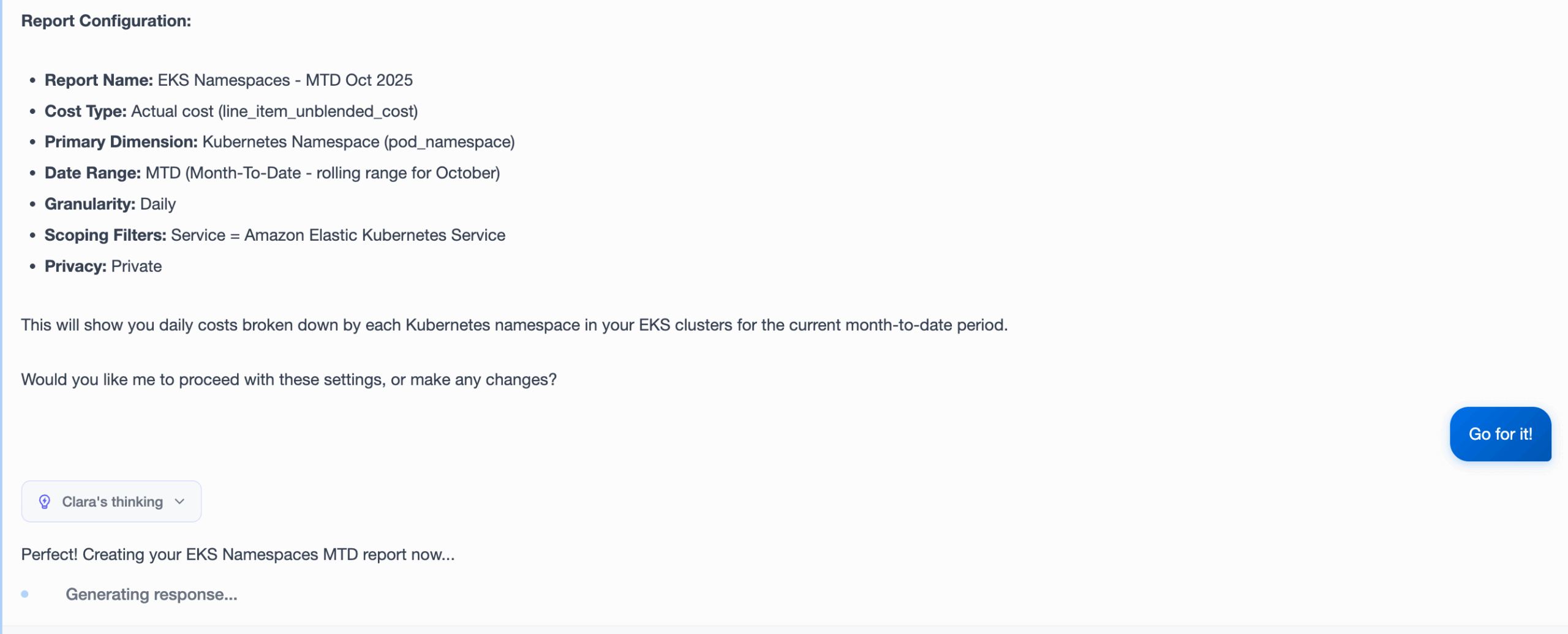 Our FinOps Agent (Clara) changes that model entirely. Clara already helps our users find unique insights and generate reports on the fly. With this new addition, Clara can save your unique insights as artifacts to reuse, share, and modify, seamlessly integrating into our existing Insights.
