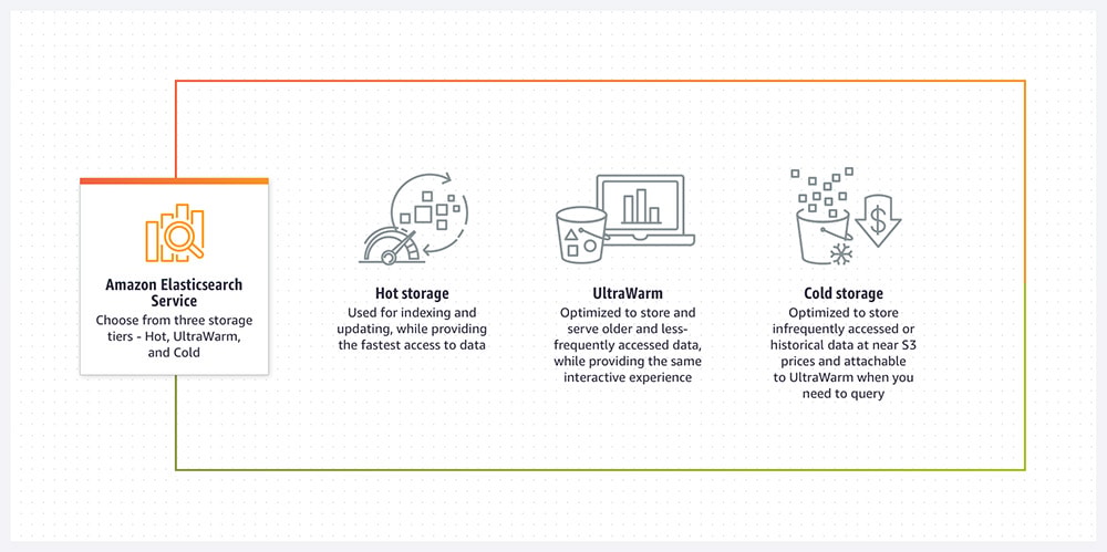 UltraWarm and cold storage are designed to reduce costs by moving older, less-frequently queried indexes out of the hot tier while keeping them searchable. Instead of paying hot-tier EBS for everything, you shift a large portion of retained data into tiers optimized to store infrequently accessed data for lower cost and different performance expectations.