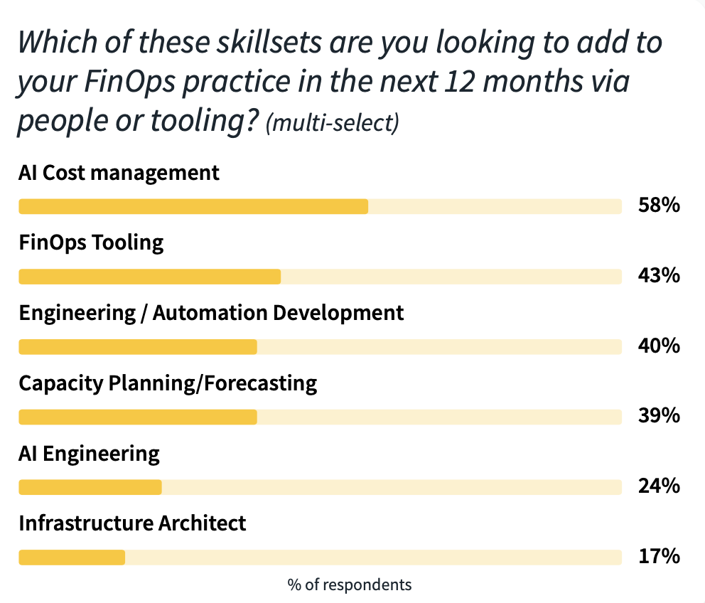 AI is now a core operating cost in 2026. That shift is reflected in staffing priorities as well. “AI cost management” is the most sought-after skillset teams say they plan to add over the next 12 months.