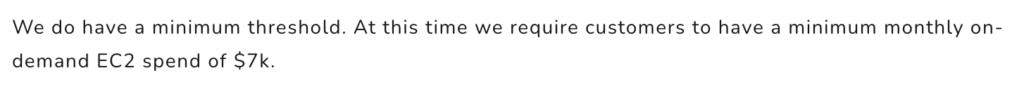 In its help documentation, Zesty states that a minimum monthly cloud spend of $7,000 in On-Demand EC2 spend is required to use its services.